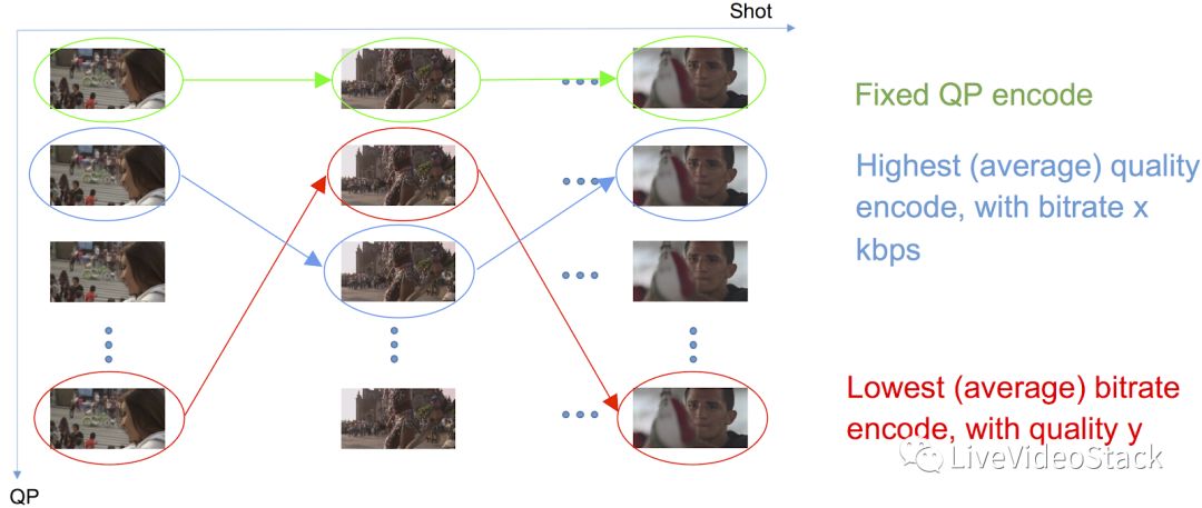 每个shot使用不同的编码参数进行多次编码,如分辨率和质量(QP等)