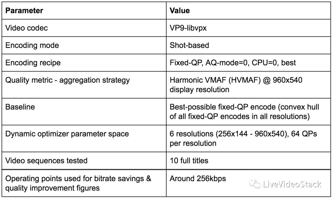 我们将动态优化器获得的结果与VP9-libvpx的最佳固定QP编码的结果进行了比较。 下表总结了所采用的方法和本实验所选择的各种参数。