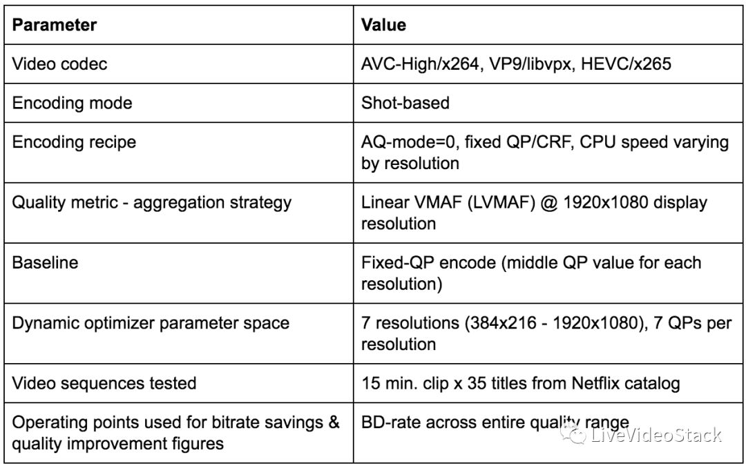 根据前面介绍的内容,可立即明白动态优化器框架中并没有特殊的编解码器。为了证实这一点,一组较短的剪辑使用了H.264 / AVC,HEVC和VP9-libvpx进行编码,实验设置如下: