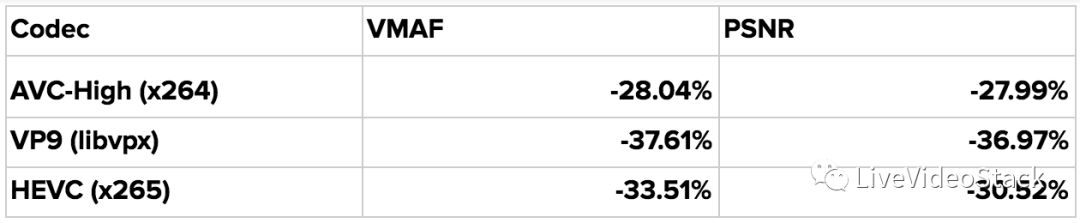 可以看到,动态优化器将这三种编解码器的编码效果均提高了大约28-38%。 请牢记,这些改进并不是比较编解码器之间的性能,而是通过使用动态优化器框架来改进各编解码器的性能。在即将到来的几周内,将使用动态优化器作为高级编码框架来对最先进的视频编解码器进行更彻底的比较。