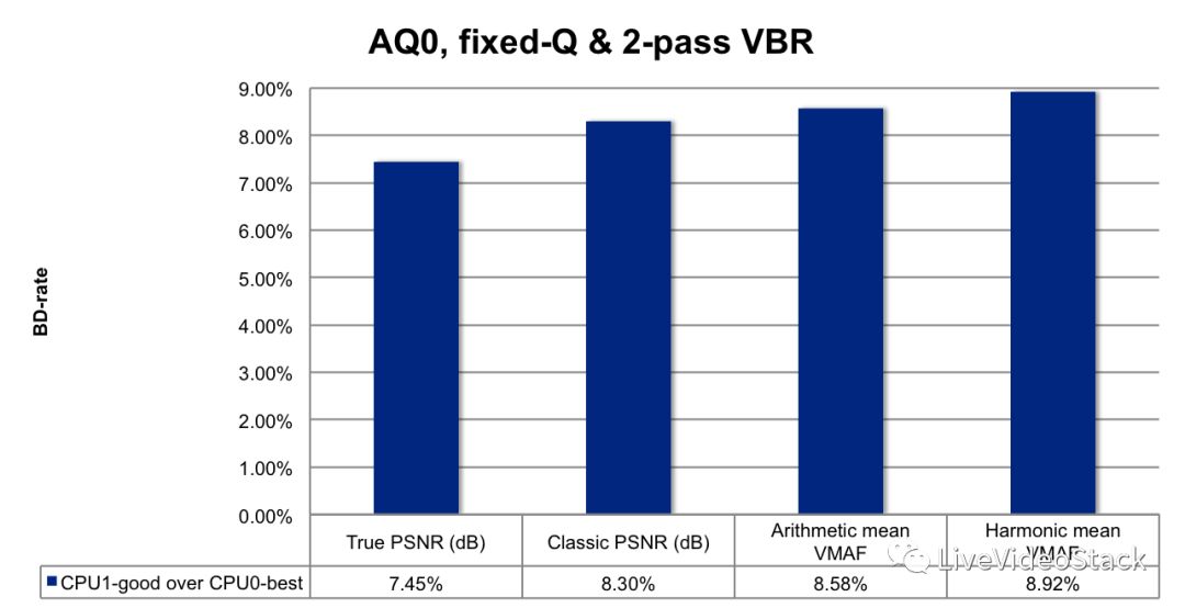 在VP9-libvpx中使用的编码参数取自以前的研究; 其研究结果发布于2016年10月举行的Netflix的“免版税编解码器开放日”。基于该研究,使用的最佳配置是“fixed-QP, AQ-mode=0, CPU=0, best”,在PSNR和VMAF质量度量方面显示出最高质量。下图显示了在VP9-libvpx编码中选择不同参数时,对平均BD速率损失的影响。