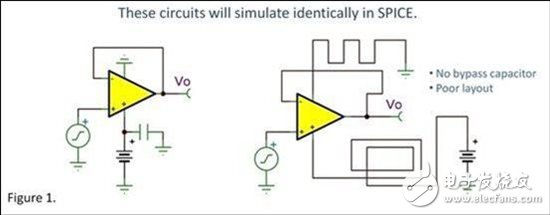 如果您的电路板布局,在板上的合适位置没有使用有效的旁路方法,也即没有旁路电容,那么您可能无法获得理想的性能。或者,您可能会面临讨厌的振荡问题。不要指责 SPICE 仿真;它不可能为您找出这些问题。 即使您利用串联电阻和电感对糟糕的电源旁路建模,宏模未必能够精确地对不利影响建模。电源引脚上,各信号之间相互影响,并可能会引起振荡。这种情况很复杂,不要尝试对其进行建模。实际上,一些旧的宏模甚至不会将输出电流建模为来自电源端的电流。我们提供的一些新的宏模非常优秀,可以仿真放大器对电源噪声的抑制程度,但却无法正确地对其可能产生的不稳定性或者振荡进行建模。 在一些我们的 IC 设计中,我们通常会对这些影响进行建模。我们对整个电路进行了十分详细的仿真—包括每个晶体管、电阻器和电容器。诸如引线电感和片上线路电阻以及不同电路板布局的电容等寄生组件都包括在内。因此,我们常常会对非完美电源的各种影响进行建模,目的是查看它对器件的影响情况。但是,这种精细度已经超出了宏模能够仿真的程度。