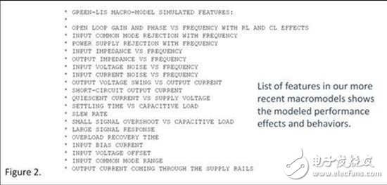 阅读运算放大器相关文本文件(请参见图 2),可以让您清楚地了解我们的宏模中所包含的一些性能属性和性能表现。多年以来,我们一直向用户提供宏模特性列表。我们免费版 SPICE 程序的 TINA-TI 中,可查看详情,具体操作为:双击原理图符号,然后点击“进入宏”。十多年前的一些宏模应该都不太复杂,因此可能没有包括在这份列表中。