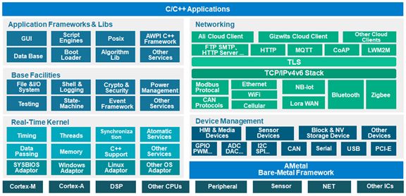 M1052跨界核心板内置Aworks IoT实时操作系统,AWorks IoT实时操作系统是采用面向框架的设计架构,支持平台组件“可插拔、可替换、可配置”、与硬件无关、与操作系统种类无关的方式设计,用户只需修改相应的头文件,即可实现应用代码的跨平台复用。