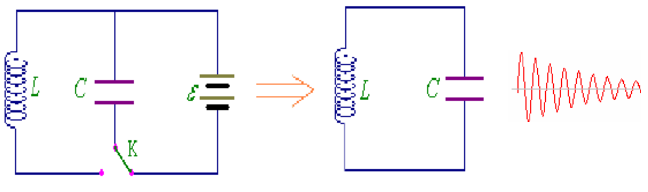 在该电路中,通过开关K 调整,可以在LC 电路上实现一个正弦波输出电路,通过K对电容C充电,充满后,将K 与电感L 连通,电容的电量将通过L 放电,因为存在电感L 的电能消耗,所以将会呈现一个逐步衰减的正弦波输出。