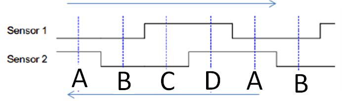通过分析,得到Sensor1/Sensor2 状态在转子转动过程中在A(0/1)->B(0/0)->C(1/0)->D(1/1)->A(0/1)->B(0/0)->C(1/0)……中循环出现,我们通过检测Sensor1/Sensor2的正弦波衰减趋势获取对应状态,再通过不同的组合状态(A:快/慢 B:快/快 C:慢/快 D:慢/慢),从而获得水表的转速。