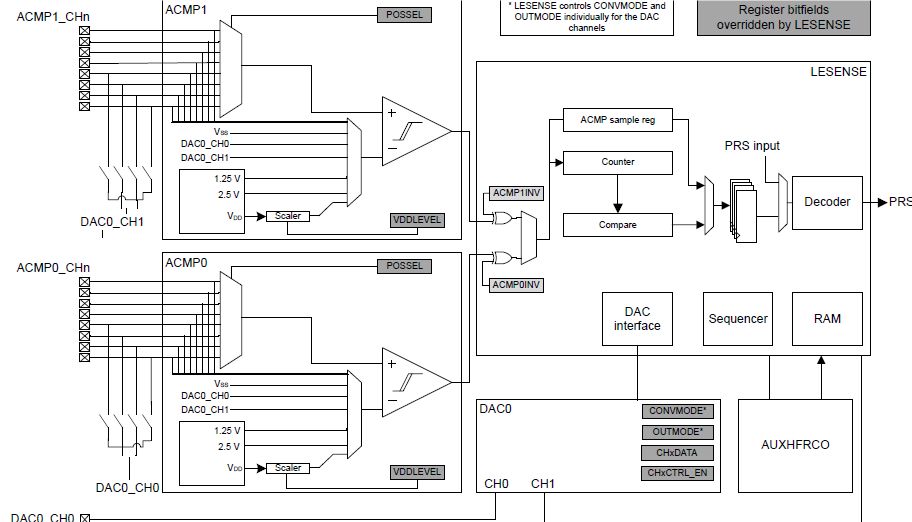 LowEnerger Sensor 在Silicon Labs 的高性能32bit MCU 中作为一个标准外设,从ARMCortex-M0+到M3/M4 系列中都存在。它是将几种不同已存在的其它外设进行组合配置而形成的的测量传感器,可用于测量电感/电容/电量等的变化,它将模拟比较器采集的模拟数据与通过高精度DAC 生成的参考电压进行比较,通过比较翻转逻辑来判断输入电压与参考电压的高低,输出结果为翻转次数,这些结果将存储在设定区域中,并通过预设的时序逻辑处理,计数处理,从而通过多次结果分析来判断所采样的模拟波形变化情况。
