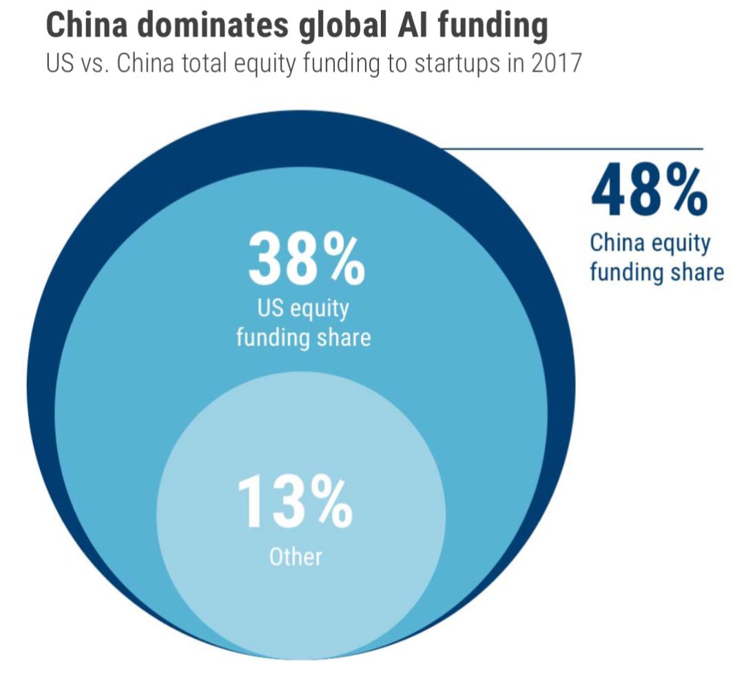 2017 年,全球投融资事件中有9%是人工智能领域的,而中国的人工智能初创公司融资金额则占了全球该领域总融资金额的近50%,首次超越美国。中国政府也在推动未来的人工智能计划,计划涵盖智能农业、智能物流到军事应用、人工智能带来的就业机会等方方面面。
