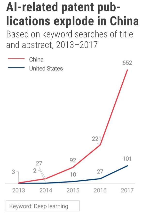 美国和中国也在争夺人工智能芯片技术的主导地位。2017年6月,中国政府表示,计划到2020年人工智能技术水平将赶上美国,到2030年,将超过美国成为人工智能的世界领导者。