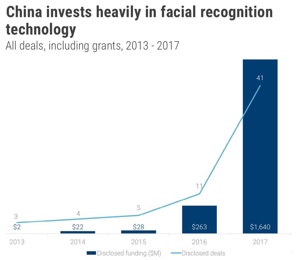 面部识别和人工智能芯片是助推中国人工智能发展的两大技术。前者迎合了政府实施的安全监控政策,后者对美国制造的芯片产生了直接的挑战。中国的独角兽公司旷视科技(Face++)、商汤科技以及初创公司云从科技是这一领域的三个主要玩家(后者获得了广州市政府 3.01 亿美元的资助)。