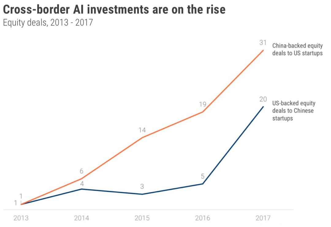 中国的科技巨头如百度、京东也在对海外的人工智能公司进行投资,包括美国。百度和京东投资了美国金融科技公司ZestFinance,腾讯投资了位于纽约的人工智能公司ObEN。明码生物科技和Pony.ai等初创公司在中美两国都开展了业务,进一步拉近了两国之间的竞争差距。