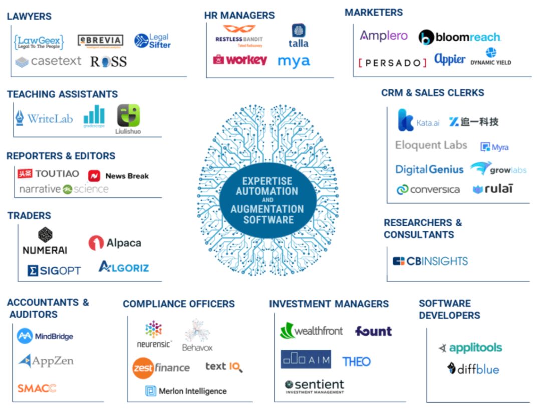 下图展示了专家级自动化及增强软件(EAAS)市场的情况。从图中你能够看到,AI EAAS 初创公司的足迹遍布各行各业。具体说来,不论是律师、记者、财富管理人员、交易员还是咨询行业从业者,都有相应的 AI EAAS 软件可以使用。