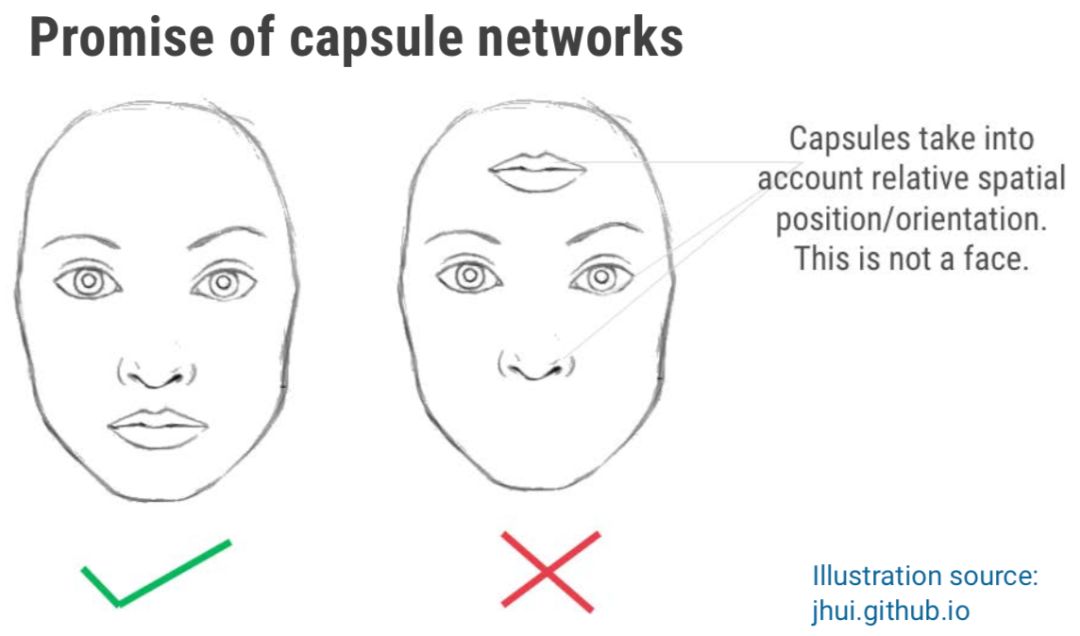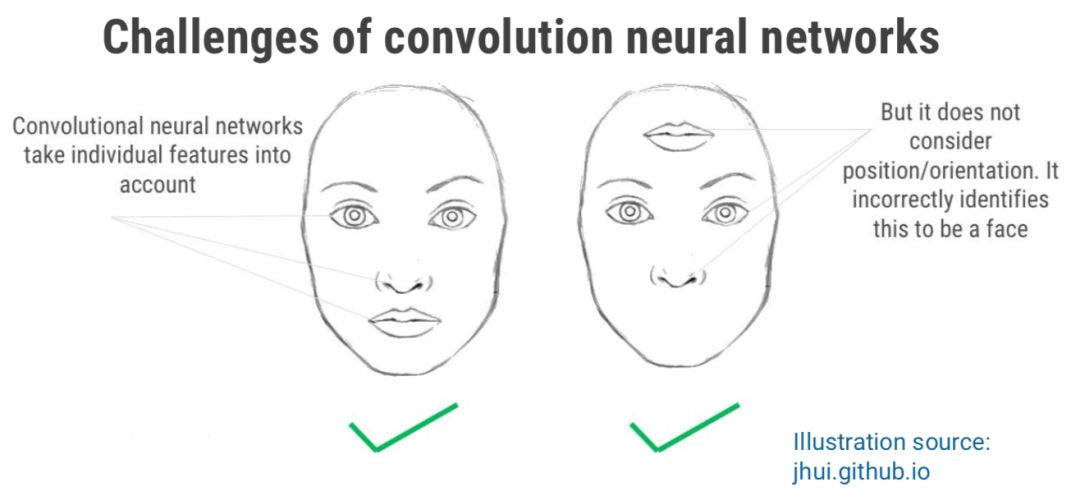 深度学习领域的领先研究者之一Geoffrey Hinton在2017年发表了一篇研究论文,介绍了胶囊网络,也就是CapsNet的概念。简而言之,胶囊网络从更高维度的特征来识别事物,所需训练数据更少,且错误率更小。比如上面的例子中,嘴巴长在眉毛上面的脸将被轻松鉴别出来,而CNN却没有办法做到这一点。