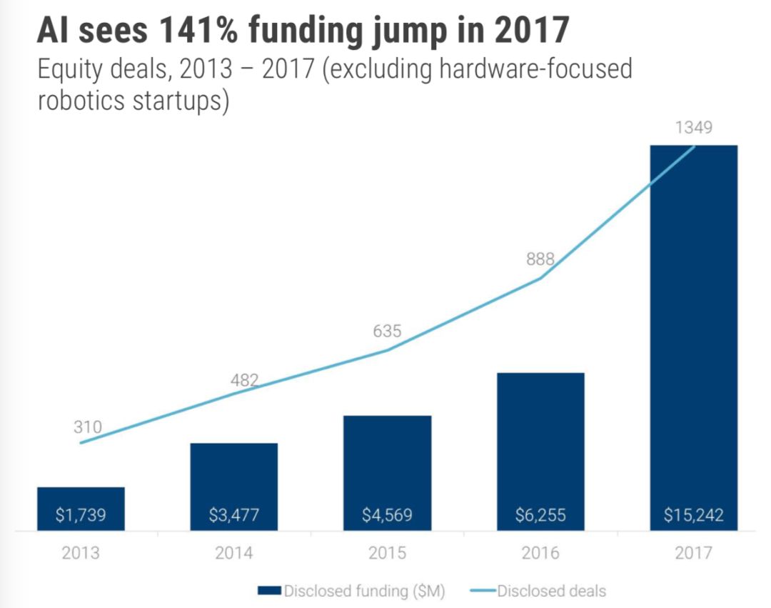 机器学习将很快走下神坛。2017年,仅是孵化器就孵化了超过300家人工智能初创公司,是2016年的三倍。这一年,投资者在人工智能领域共计投资超过152亿美元资金,是2016年筹集资金的141%。自2016以来,有超过1100家的新兴人工智能公司完成了首轮融资。