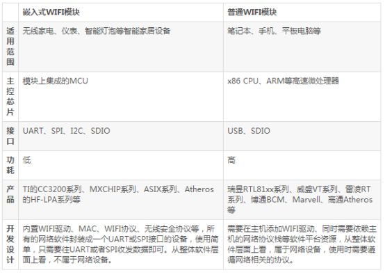 我们都知道笔记本、手机、平板电脑等这类产品具有强大的CPU和大容量的存储器进行网络通信数据的处理和存储,因此在使用WIFI时不需要额外的MCU,完全借助其高速处理器和庞大的软件系统。但是对于家电,仪表,LED灯等智能家居产品,因为该类产品的主控芯片可能是成本很低、功能简单的MCU,因此这类产品无法支持普通Wi-Fi的功能。同时,还有一个重要的原因就是普通Wi-F的功耗比较高,而嵌入式WIFI在功耗上做了很大的改善,比较适合对功耗要求高的无线家电设备。