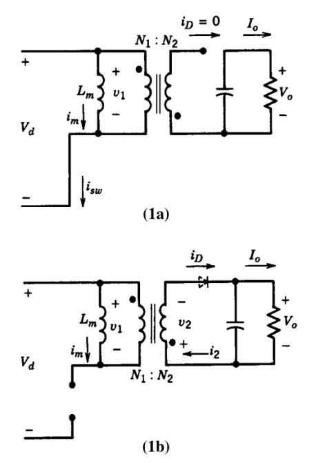 图 1.1a) 主耦合电感器中存储的电能;1b)电能传送至二次绕组