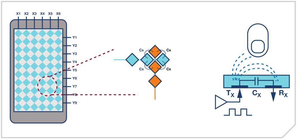 大部分消费级触摸屏使用ITO (铟锡氧化物)材料,有导电且透光的特性,透光率通常大于90%。图2是其中一种钻石型互电容物理结构。X列ITO和Y行ITO位于不同层上,它们的交叉节点产生的微弱电容就是我们想要测量的互电容CX。当手指靠近它时,如右图所示,由于电场的改变,等效CX会随之减小。