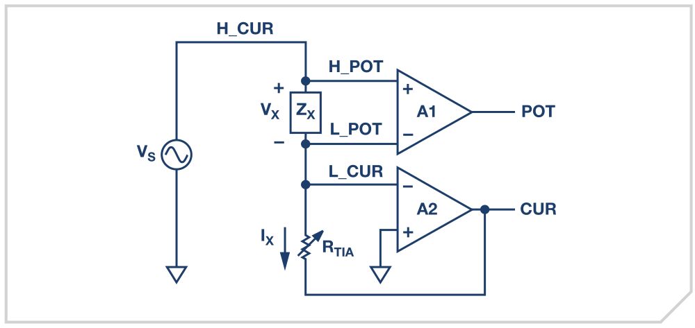 阻抗测量测试项目涉及不同类型的阻抗(电阻和电容),所以需要一个阻抗测量设备。此类测量可通过自平衡电桥电路来完成,如图4所示。它含有一个由已知阻抗(RTIA)和未知阻抗ZX的电路组成。与传统分压法的比例测量不同,一个有源运放电路A2用于控制L_CUR点的电压,使其保持恒定电位(本例中为地),而VS向H_CUR点施加一个固定频率的信号。A2输出端的相反信号与流过ZX的电流IX直接相关。为了避免受到电缆和开关寄生效应的影响,第二个放大器A1用于直接检测ZX上产生的电压。节点POT和CUR产生的波形分别代表被测阻抗(ZX)上的电压和电流信号,因而可通过模拟或数字方法来计算阻抗。
