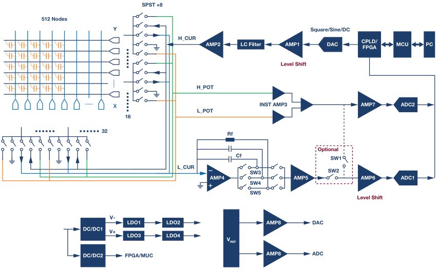 信号激励源是一个高速DAC或DDS,产生50 kHz至200 kHz波形用于电容测试和ITO电阻测试。它还能产生可编程直流电压信号用于相邻线路的开路/短路测试。AMP1在该电路中有两个作用:差分到单端转换和电平搬移到双电源信号模式。幅度调整可以放在该放大器、DAC数字域或DDS满量程控制端口处完成。