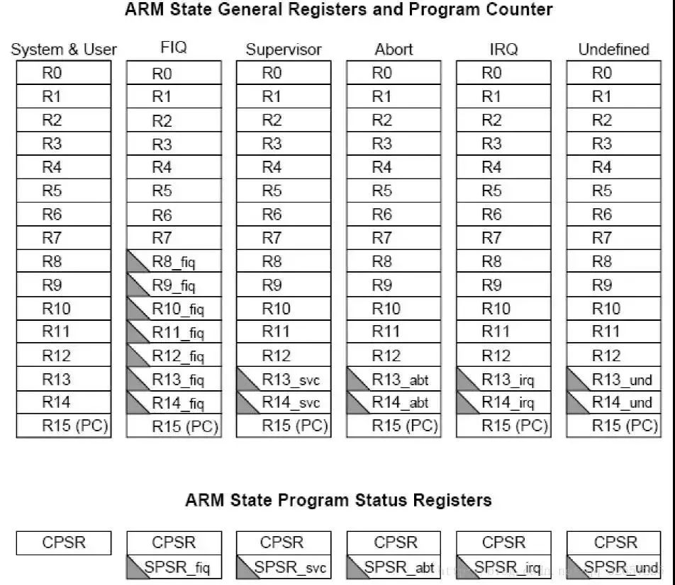 ARM共有37个32位寄存器,其中31个为通用寄存器,6个为状态寄存器,包括R0-R15,R8_fiq-R14_fiq,R13_svc,R14_svc,R13_abt,R14_abt,R13_irq,R14_irq,R13_und,R14_und,CPSR,SPSR_fiq,SPSR_svc,SPSR_abt,SPSR_irq,SPSR_und。如图。