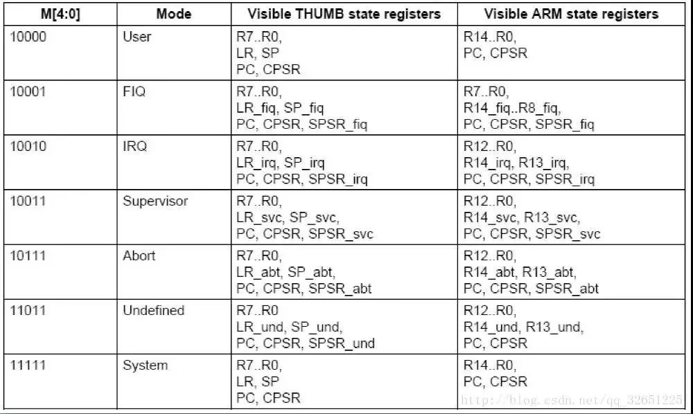 8. M4-M0:表示当前处理器的工作模式,如图: