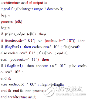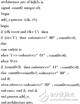 插“V”模块主要是对消息代码里的四连0串的检测,即当出现四个连0串的时候,把第四个“0”变换成符号“V”,用“11”标识。 “1”用“01”标识,“0”用“00”标识。其模型如图2所示,实现的VHDL结构代码如artv: