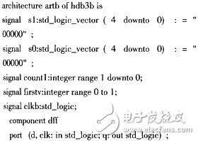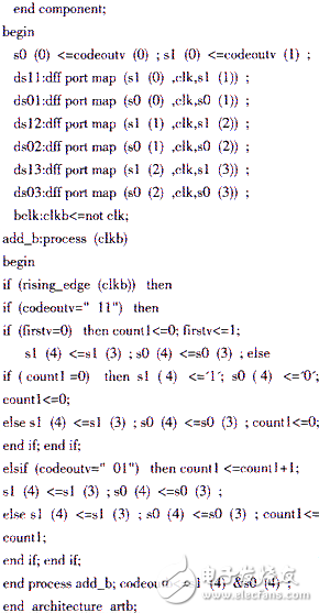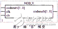 插“B”模块的建模思路是当相邻“V”符号之间有偶数个非0符号时,把后一小段的第1个“0”变换成一个“B”符号。可用一个4位的移位寄存器来实现延迟,这样经插“V”处理过的码元,可在同步时钟的作用下同时进行是否插“B”的判决,等到码元从移位寄存器里出来的时候,就可以决定是应该变换成“B”符号,还是照原码输出。输出端用“11”表示符号“V”,“01”表示“1”码, “00”表示“0”码,“10”表示符号“B”。其模型如图3所示,VHDL的结构代码如artb: