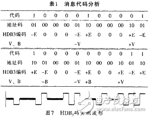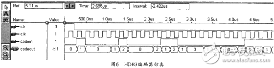 在此,以四连“0”的可能性通过如表1所列的多“0”消息代码进行分析,并利用EDA工具对VHDL源程序进行编译、适配、优化、逻辑综合与仿真。仿真结果显示其完全可以达到编码要求。其仿真图如图6所示。而将HDB3编码硬件描述下载到CPLD或FPGA目标芯片中,然后连接好CC4052进行实际应用测试(用示波器测得)的编码波形如图7所示。