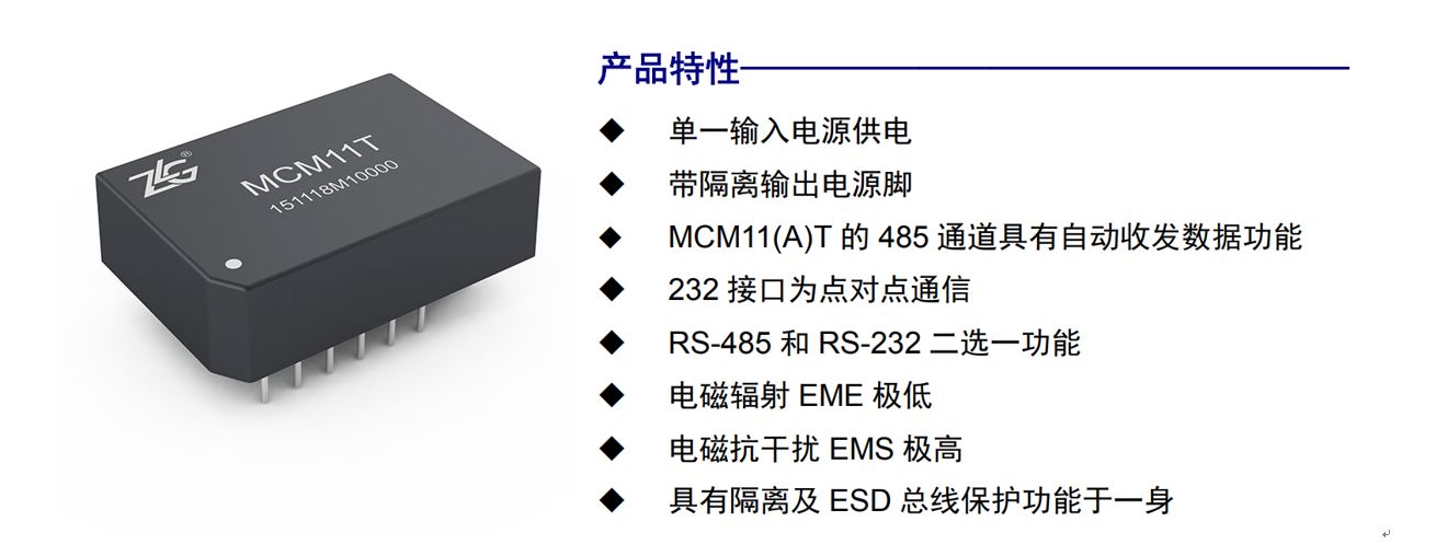 ZLG致远电子根据目前工业产品通信隔离需求,专门研发出MCMxx(A)T系列多协议隔离模块,将隔离电源、通信隔离电路、ESD保护电路集成封装在一个模块中,将电路设计化零为整,只需要简单的电气连接,就可以实现RS-485/232通信隔离,隔离电压高达3500VDC,满足绝大多数应用需求。