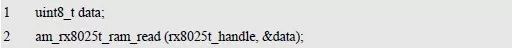 其中,handle 为RX8025T 实例句柄,data 为写入的单字节数据。若返回AM_OK,表示数据写入成功,反之失败,写入0x55 至RAM 中的范例程序详见程序清单6.82。