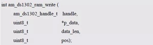 其中,handle 为DS1302 实例句柄,p_data 指向待写入数据的首地址,data_len 指定写入数据的字节数,最大为31 字节,pos 指定了写入RAM 的起始地址,DS1302 的RAM 空间大小为31 字节,对应的地址为0 ~ 30,pos 的有效范围即为0 ~ 30。若返回AM_OK,表示数据写入成功,反之失败,写入31 字节数据至RAM 中的范例程序详见程序清单6.93。