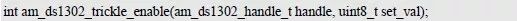 DS1302 具有双电源供电,当芯片由VCC2 供电时,可以通过可编程涓流充电器,使VCC2向VCC1 流入很小的电流,以便为连接到VCC1 的电池充电。使能涓流充电的函数原型为: