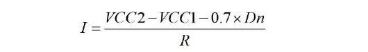 当总开关打开后,充电电流的大小是由选择的二极管个数(1 个或2 个)和电阻阻值(2KΩ、4KΩ 或8KΩ)决定的。二极管的个数决定了电压的压降,电流的计算公式为: