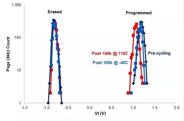 Endurance passes 500K cycles at 85°C w/o ECC. Vt window > 1.2V after 500K cycling.