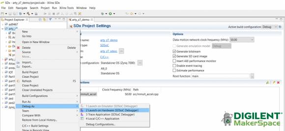 如果我们构建这个设计时没有点击预估性能选项,那么我们可以使用调试器(debugger)像正常应用那样下载和运行示例程序。要想启动调试器,在工程上右击,然后选择Debug As ->Launch on Hardware(SDSoC Debugger)。参考下图启动调试界面,这里我们会将应用下载到Arty Z7,并在编程入口使Zynq挂起。将SDSoC终端与Arty Z7 UART(串口)连接我们就可以看到示例程序的运行结果: