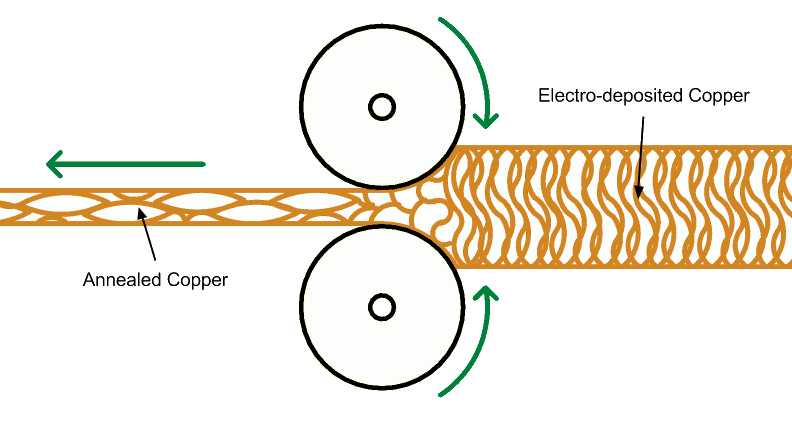 图2:夸张版的轧制韧化过程插图,非比例构图。铜箔通过高压辊轮后,可以在平面方向上延伸它的晶粒结构,使铜更柔软并且增加了z轴的弹性。