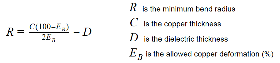我们可以使用IPC-2223B公式(公式1表示单面,公式2表示双面,等等),根据铜的允许变形程度和其他材料特性,来确定最小允许弯曲半径部分。