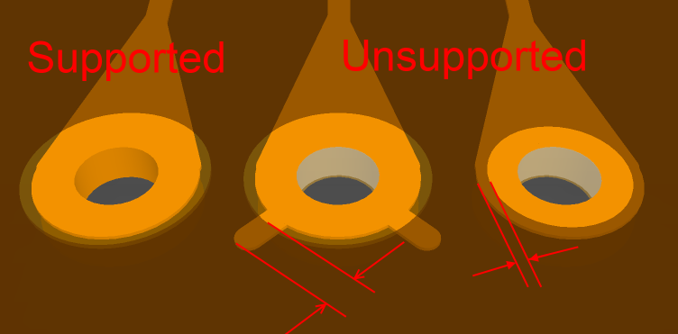 由于采用了低粘性的粘合剂(相对于FR-4),柔性电路上的铜更容易从聚酰亚胺基板上脱离。所以给裸露的铜皮提供加固尤为重要。涂镀的通孔为2个柔性层提供了恰当的锚定,所以使用过孔是非常好加固方式。正因如此(提供了z轴的扩展),许多加工厂建议在软硬结合板和柔性电路上添加深度达1.5密耳的涂镀通孔。表面贴装的焊盘和非涂镀的通孔焊盘本身没有加固措施,所以需要额外的加固来防止脱离。