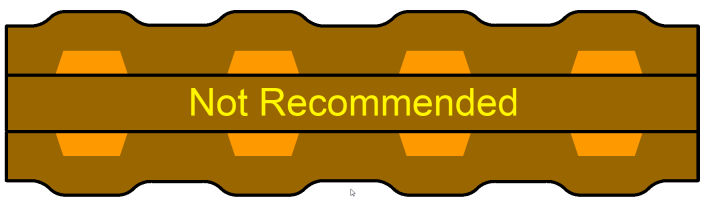 提到这一点,我同时想到,传统的阴影多边形会在0°、90°和45°角的方向存在多余的铜皮加强。更优化的模式是六角形方式。使用负片层和阵列的六角焊盘就可以解决这个问题,使用复制和粘贴的方法可以更快速地建立阴影多边形。