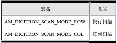 如表7.8 所示为数码管扫描方式,scan_mode 表示数码管的扫描方式,可选的扫描方式有行扫描或列扫描方式,扫描方式是由硬件决定的,对于MiniPort-View,其仅单行两个数码管,横向的两个数码管共用段码引脚,因此,只能使用列扫描方式,即一次扫描一列(一个数码管),scan_mode 的值为AM_DIGITRON_SCAN_MODE_COL。