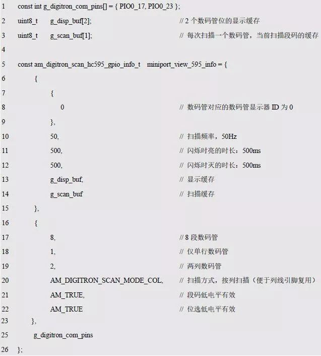将其与GPIO 输出段码的数码管实例信息相比(am_digitron_scan_gpio_info_t)可以发现,其仅仅少了一个数据成员p_seg_pins,其它信息都是完全一样的。这是由于当使用595输出段码时,不再需要使用GPIO 输出段码,因此,也就不用指定段码引脚。基于此,只需要从GPIO 输出段码的数码管实例信息中去掉段码引脚,即可得到HC595 输出段码的数码管实例信息: