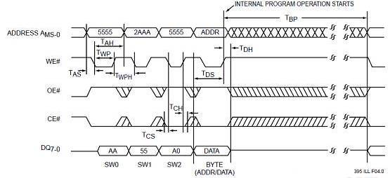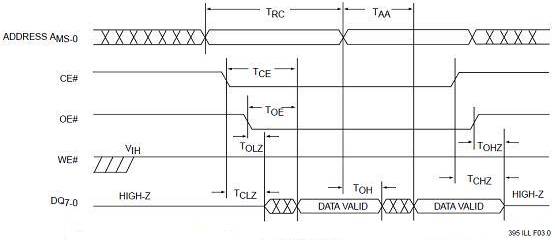 从图中我们可以看出ADDRESS是表示地址总线的,DQ是表示数据总线的,CE是片选信号,且是低电平有效,其宽度要保证在进行读操作时总是有效的。学会看时序图对于做嵌入式系统开发非常有帮助,因为我们不可避免的要与芯片打交道。在时序图中,通常会标识很多的时间需求信息。在写启动代码时需要初始化各地址空间的片选地址寄存器和读写时序,时序的配置依据就是来自于外设芯片的时间需求,这是芯片手册很重要的一部分内容。当一个地址空间中存在多个外设芯片时,我们需要考虑到其中最慢的外设芯片的时间需求,否则的话有的芯片就不能正常工作。
