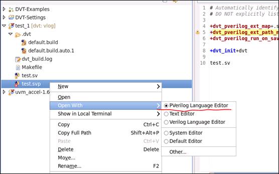 配置好default.build文件后,重新build工程。打开预处理文件,需要文件右键,选择Open With->PVerilog Language Editor。