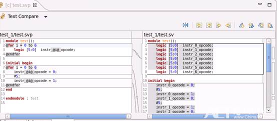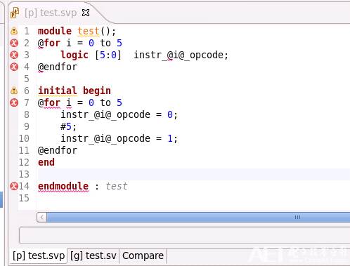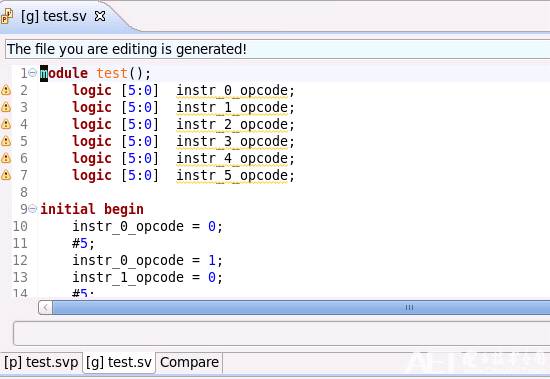 此时test.svp的代码区域,变成下面的界面,在左下角,有[p],[g],Compare。分别表示源文件,生成文件,文件比较。
