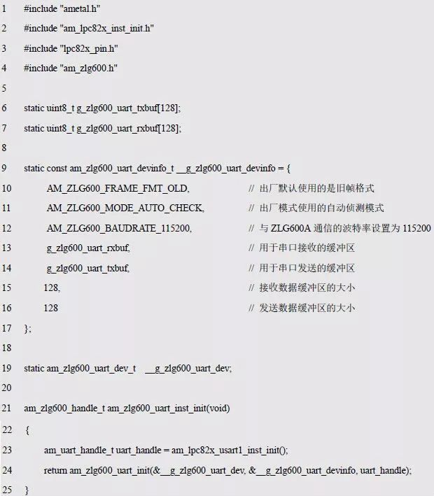 若选择LPC824 的USART1 与ZLG600A 通信,则可以通过LPC82x 的USART1 实例初始化函数am_lpc82x_usart1_inst_init()获得UART 句柄。即: