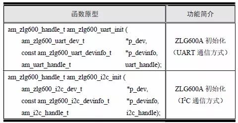 AMetal 已经提供了ZLG600A 的驱动函数,在使用其它各功能函数前必须先完成初始化,其初始化函数详见表6.20。
