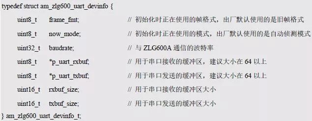 注:若本次初始化完成后,通过后续相关功能接口函数更换使用的帧格式(如将旧帧格式更换为新帧格式),那么在系统下次启动调用ZLG600A 初始化函数时,需要确保frame_fmt成员的值为更新后的帧格式(如新帧格式)。