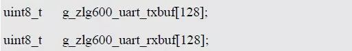 其中,g_zlg600_uart_txbuf[128]为用户自定义的数组空间供发送使用,充当发送缓冲区,其地址(数组名g_zlg600_uart_txbuf 或首元素地址& g_zlg600_uart_txbuf[0])作为实例信息中p_uart_txbuf 成员的值,数组大小(这里为128)作为实例信息中txbuf_size 成员的值。同理,g_zlg600_uart_rxbuf[128]充当接收缓冲区,其地址作为实例信息中p_uart_rxbuf 成员的值,数组大小作为实例信息中rxbuf_size 成员的值。基于此,实例信息定义如下: