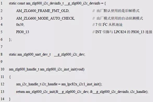 程序清单6.100 新增ZLG600A 的I2C 通信方式的实例初始化函数(am_hwconf_zlg600.c)