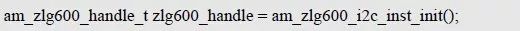 am_zlg600_i2c_init()与am_zlg600_uart_init()的返回值相同,该返回值为ZLG600A 实例的句柄,该句柄将作为其它功能接口的第一个参数(handle)的实参。若返回值为NULL,说明初始化失败;若返回值不为NULL,说明返回一个有效的handle。